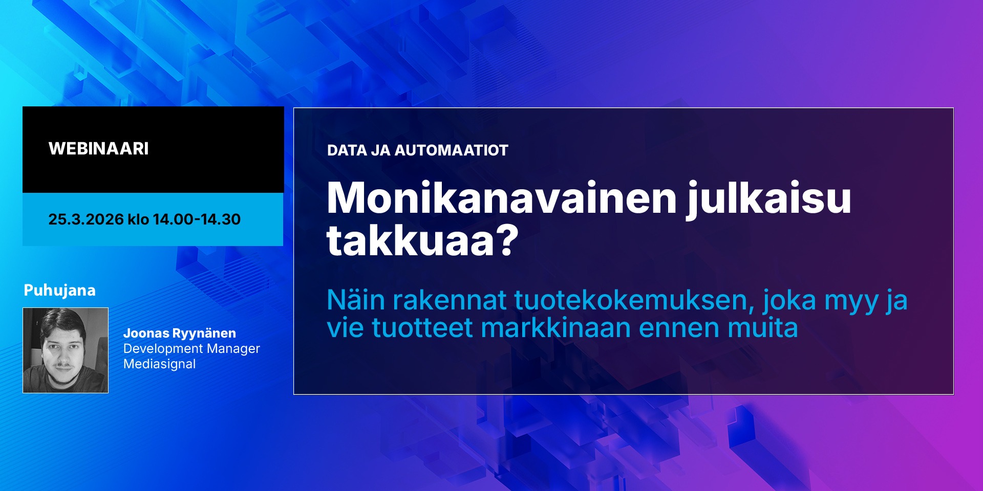 Mediasignalin kehitysjohtaja Joonas Ryynänen käy konkreettisten esimerkkien kautta läpi, miten oikealla rakenteella ja teknologialla rakennetaan tuotekokemus, joka tukee myyntiä ja nopeuttaa markkinoille menoa.